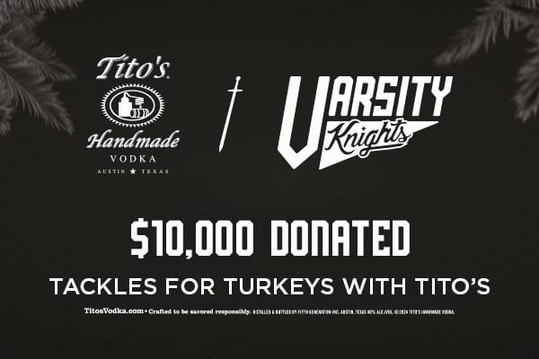 On November 25th, Tito's Vodka and Varsity Knights teamed up to donate Thanksgiving meals to over 1,000 underserved people in downtown Orlando. $200 was donated towards the cause for every UCF tackle for loss this season. Thank you Tito's Vodka and Varsity Knights for bringing the Thanksgiving spirit to Orlando!